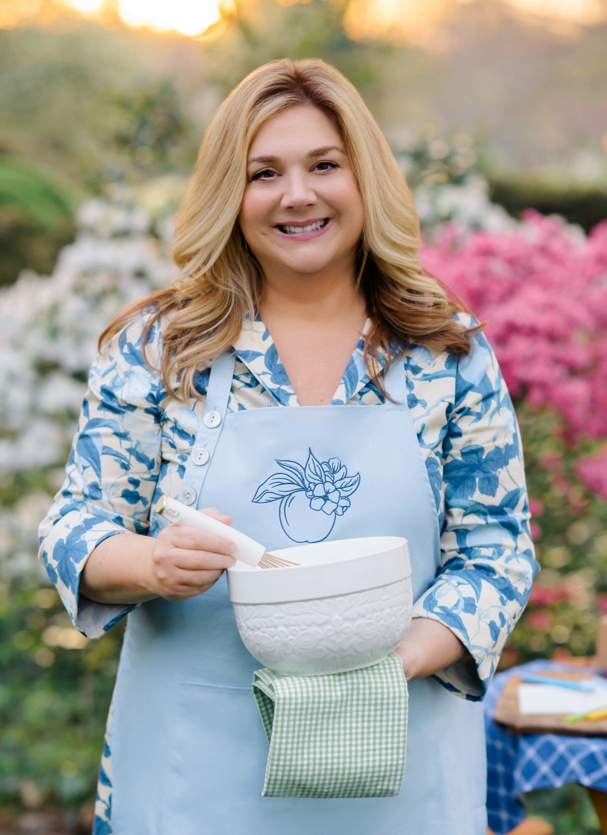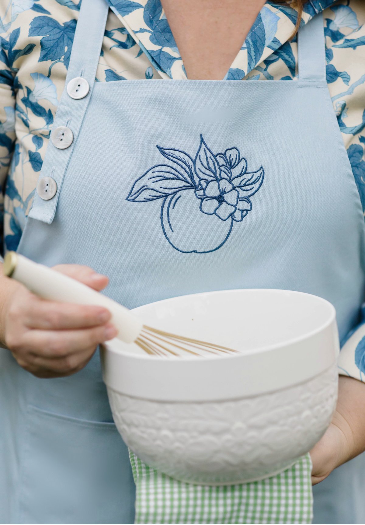 I love my apron, and I think you will too! With a custom embroidered Southern Discourse apple right on the bib, it’s as pretty as it is functional. A light weight cotton blend, the fabric has been treated to repel water, oil and most splatters- they simply wipe or blot away! The top tie fastens with buttons for comfort and to adjust the size. 2 large pockets hold any gadgets (like a meat thermometer), your phone, recipe cards, even a kitchen towel handy while cooking. Ties at the waist in the back, or ties can be wrapped around and tied in the front.