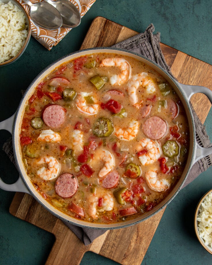 This easy Louisiana gumbo has a simple blonde roux with a savory nutty flavor and is packed with enough spices, herbs, veggies, rich smoked sausage and tender shrimp.